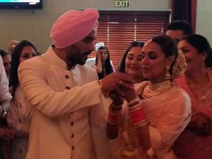 अ िनेत्री नेहा धूपिया आणि अंगद बेदी यांनी दिल्ली येथे लग्न केले. दोघांच्या लग्नाचे काही फोटोज् सध्या सोशल मीडियावर व्हायरल होत आहेत. वास्तविक नेहा आणि अंगदच्या लग्नाची कोणाला भनकही लागली नसती, परंतु लग्नात सहभागी झालेल्या काही लोकांना या लग्नाविषयीची माहिती असल्याने ही बाब पुढे आली आहे. नेहा आणि अंगदच्या लग्नाचे जे फोटो समोर आले आहेत, त्यामध्ये अभिनेता आणि सूत्रसंचालक गौरव कपूर, माजी क्रिकेटपटू अजय जडेजा आणि आशीष नेहरा बघावयास मिळाले.
