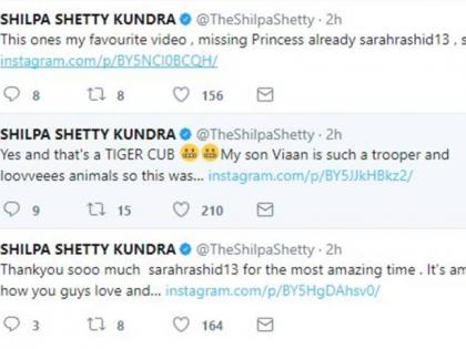 अ िनेत्री शिल्पा शेट्टी मुलगा वियानसोबत दुबई ट्रिपवर गेली होती. यादरम्यान शिल्पा आणि वियानने एका प्राणी संग्रहालयाला भेट दिली. याठिकाणी शिल्पाची भेट एका चिंपाजीबरोबर झाली. शिल्पाने लगेचच या चिंपाजीला ‘प्रिंसेस’ असे नावही दिले. शिवाय त्याच्यासोबतचा एक व्हिडीओ इन्स्टाग्राम अकाउंटवर शेअर केला. व्हिडीओमध्ये शिल्पा चिंपाजीबरोबर बघावयास मिळत असून, चिंपाजी शिल्पाला स्माइल देत त्याला किस करताना दिसतो. परंतु हा व्हिडीओ शिल्पाच्या चाहत्यांना फारसा भावला नसल्याचे दिसून आले. त्यांनी शिल्पाच्या या व्हिडीओला अशा काही उलट-सुलट प्रतिक्रिया दिल्या की, शिल्पाला काही वेळातच हा व्हिडीओ डिलीट करावा लागला.