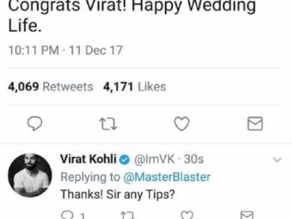 आम्ही एकमेकांना सदैव प्रेम बंधनात राहण्याचे वचन दिले आहे. तुम्हा सर्वांच्या प्रेमाने हा दिवस आणखीच खास होईल. आमच्या आयुष्याचा हिस्सा बनल्याबद्दल धन्यवाद, असे tweet करत सोमवारी रात्री साडे आठच्या सुमारास विरूष्काने लग्न झाल्याचे जाहिर केले. यानंतर रात्री १० वाजून ११ मिनिटाला सचिनने सोशल मीडियावरून विराटला लग्नाच्या शुभेच्छा दिल्यात. ‘अभिनंदन विराट, वैवाहिक जीवन आनंदमयी ठरो,’ असे सचिनने लिहिले. विराटनेही लगेच सचिनच्या या शुभेच्छांच्या स्वीकार केला. शिवाय काही टिप्स? असा खट्याळ प्रश्नही त्याने सचिनला विचारला. मग काय,या प्रश्नावर सचिनने विराटची चांगलीच ‘विकेट’ घेतली. ‘रात्री हेल्मेट घालून झोप,’ असा सल्ला सचिनने विराटला दिला. आता सचिनचा हा सल्ला ऐकून विराट व अनुष्काची काय स्थिती झाली असणार, याचा अंदाज तुम्ही बांधू शकताच. विराट व अनुष्का दोघेही सचिनचे हे tweet वाचून पोट धरून हसत सुटले असणार...