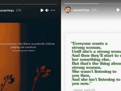 नुसरतने इन्स्टास्टोरी शेअर केली आहे. पहिल्या पोस्टमध्ये तिने जज करणा-या लोकांना फटकारले आहे. आपणा सर्वांना एका अशा व्यक्तिची गरज असते,जी जज न करता संयमाने तुमचे म्हणणे ऐकेल, असे तिने पहिल्या पोस्टमध्ये लिहिले आहे. दुस-या पोस्टमध्ये तिने खंबीर महिलांबद्दल लिहिले आहे. ती लिहिते, खंबीर महिला सर्वांना आवडतात. पण ती खंबीर बनते तेव्हा तिच्याबद्दल वेगवेगळ्या गोष्टी बोलल्या जातात. अर्थात खंबीर महिलेचे हेच वैशिष्ट्य आहे की, ती ना आधी कुणाचे ऐकायची, ना आता ऐकणार...