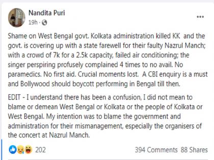 नंदिता पुरीने सोशल मीडियावर एक पोस्ट करत आपल्या संतापाला वाट मोकळी करून दिलीये. तिने लिहिले, ‘पश्चिम बंगालला लाज वाटायला हवी. कोलकाता प्रशासनाने केकेची हत्या केली आणि आता पश्चिम बंगाल सरकार यावर पडदा टाकण्याचा प्रयत्न करतेय. कॉन्सर्टमध्ये कोणतीही दक्षता घेतली गेली नव्हती. अडीच हजार क्षमता असलेल्या नजरूल मंचावर 7 हजार लोक होते. एसी काम करत नव्हता. केके घामाघुम झाला होता. 4 वेळा तक्रार करूनही त्याचं कोणीही ऐकलं नाही. ना औषधं होती, ना फर्स्ट एडची सोय होती. याची सीबीआय चौकशी व्हायला हवी. तोपर्यंत बॉलिवूडने प. बंगालमध्ये परफॉर्म न करता बायकॉट केलं पाहिजे,’ अशा आशयाची पोस्ट तिने लिहिली आहे.