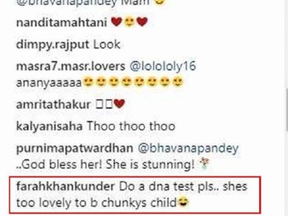 चंकीची पत्नी भावना पांडे हिने तिच्या इन्स्टाग्राम अकाऊंटवर मुलगी अनन्याचा एक सुंदर फोटो पोस्ट केला. या फोटोत अनन्या कमालीची सुंदर दिसतेय. हा फोटो फराहने बघितला अन् नको ते बोलून गेली. ‘प्लीज हिची डीएनए टेस्ट करा. चंकी पांडेची मुलगी आणि इतकी सुंदर,’ अशी कमेंट फराहने केली. फराहचा सेन्स आॅफ ह्युमर खूप चांगला आहे, हे तर सगळ्यांनाच माहित आहे. पण फराहच्या या कमेंटचा विचार केल्यास त्यातून नको ते अर्थच जास्त निघतात. त्यामुळेच फराहचा हा ‘विनोद’ अर्थातच लोकांना पचला नाही. मग काय, या विनोदानंतर फराह स्वत:च ‘विनोद’ बनली. एक खराब जोक, अशा प्रतिक्रिया लोकांनी दिल्या.