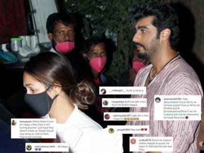अर्जुन कपूर आणि मलायका अरोराचा एक फोटो पॅपराझीने त्याच्या इंस्टाग्राम अकाउंटवर शेअर केला. या फोटोत ते दोघे कारमध्ये बसताना दिसले. साधारण असणाऱ्या या फोटोवर लोकांनी एकानंतर एक इतके वाईट कमेंट्स केल्या की त्या वाचताना लाज वाटते. यात तर काहींनी त्यांना जोड्याने हाणले पाहिजे असे लिहिले आहे. तर काहींनी घर तोडू, म्हातारीसोबत अर्जुन म्हातारा झाला, आई-मुलगा यासारख्या कमेंट केल्या.