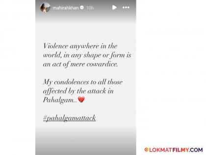 माहिराने तिच्या इंस्टाग्राम स्टोरीवर एक पोस्ट शेअर केली. ज्यामध्ये तिनं लिहिलं, "हिंसाचार, जगात कुठेही असो, कोणत्याही स्वरूपात असो, ते एक भ्याड कृत्य आहे. पहलगाम हल्ल्यात मृत्युमुखी पडलेल्या लोकांप्रती मी संवेदना व्यक्त करते", या शब्दात तिनं भावना व्यक्त केल्या. माहिराने शाहरुख खानच्या 'रईस' चित्रपटातून बॉलिवूडमध्ये पदार्पण केलं होतं. माहिरा तिच्या पहिल्या चित्रपटानंतर भारतासह जगभरात लोकप्रिय झाली होती. मात्र, त्यानंतर ती कोणत्याही बॉलिवूड चित्रपटात दिसली नाही. पण, भारतात तिचा चाहतावर्ग मोठा आहे. त्यामुळे पहलगाम हल्ल्यावर तिनं उशीरा प्रतिक्रिया दिल्यानं तिचे भारतीय चाहते नाराज झाले.