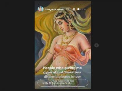 प्राचीन भारतीय पेहरावातील एका तरुणीचा फोटो कंगनाने तिच्या इन्स्टाग्राम स्टोरीवर शेअर केला आहे. हा फोटो शेअर करत तिने म्हटले की, जे लोक मला सनातन धर्माबद्दल ज्ञान देत आहेत त्यांनी कृपया लक्षात घ्या तुम्ही अब्राहमिक सारखे वागत आहात.