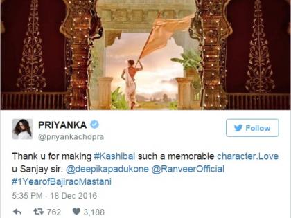 दीपिका पादुकोण आणि रणवीर सिंग ही जोडी ‘बाजीराव मस्तानी’ अगोदर ‘रामलीला’ चित्रपटात एकत्र दिसली होती. त्यांच्या या जोडीला मिळालेल्या चाहत्यांच्या असंख्य हिट्समुळे त्यांची ‘बाजीराव मस्तानी’तील जोडी अविस्मरणीय आहे. यात दीपिकाने केलेली मस्तानीची भूमिका, प्रियांकाने केलेली काशीबाईची भूमिका या भूमिका त्यांच्यासाठी आदर्श भूमिका ठरल्या. चित्रपट प्रदर्शित होऊन एक वर्ष पूर्ण झाल्याने या सर्वांनी ट्विटरच्या माध्यमातून त्यांच्या प्रतिक्रिया आणि आनंद व्यक्त केला आहे.