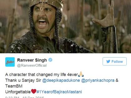 द ग्दर्शक संजय लीला भन्साळी यांनी ‘बाजीराव मस्तानी’ च्या माध्यमातून बॉलिवूडला अभिमान वाटावा अशी कलाकृती निर्माण केली. रणवीर सिंग - दीपिका पादुकोण - प्रियांका चोप्रा यांनी पेशवा बाजीराव-मस्तानी - काशीबाई यांच्या केलेल्या भूमिका अविस्मरणीय आहेत. या कलाकृतीला आता एक वर्ष पूर्ण झाले आहे. रणवीरने केलेली पेशवा बाजीरावची भूमिका ही त्याच्यासाठी आयुष्य बदलणारी होती, असे तो सांगतो.