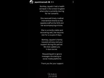 जयश्री यांच्या कुटुंबाने त्यांच्या अधिकृत इन्स्टाग्राम हँडलवर त्यांच्या आरोग्याबाबतचे अधिकृत पोस्ट शेअर केली आहे.ज्यामध्ये लिहिले आहे की, "बॉम्बे जयश्री यांची प्रकृती युनायटेड किंगडममध्ये बिघडली आहे, त्या त्यांच्या म्युझिक कॉन्सर्टसाठी तिथे गेल्या आहे. NHS स्टाफ आणि त्यांच्या सहकारी कलाकारांचे आभार, त्यांना वेळेवर वैद्यकीय उपचार मिळाले. त्यांची प्रकृती आता स्थिर आहे. त्यांन आता काही दिवस विश्रांतीची गरज आहे.