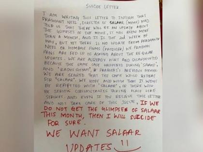 प्रभास लवकरच 'सालार' या चित्रपटात झळकणार आहे. त्यामुळे या चित्रपटाविषयी जाणून घेण्यासाठी नेटकरी उत्सुक आहेत. मात्र, मधल्या काळात या चित्रपटाविषयी कोणतीही अपडेट समोर न आल्यामुळे एका चाहता चांगलाच त्रस्त झाला आहे. इतकंच नाही तर या चित्रपटाचे अपडेट्स न दिल्यास आत्महत्या करु अशी धमकीदेखील या चाहत्याने पत्राच्या माध्यमातून दिली आहे.