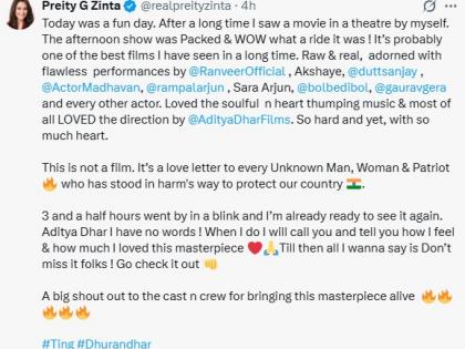 नुकताच प्रीतीने 'धुरंधर' चित्रपट पाहिला आणि तीचित्रपट आणि त्यामधील कलाकारांच्या कामाचं कौतुक करण्यापासून स्वतःला रोखू शकली नाही. सोशल मीडियावर याबाबत भलीमोठी पोस्ट लिहून शेअर केली. अभिनेत्रीची ही पोस्ट चांगलीच व्हायरल होताना दिसतेय. शिवाय या पोस्टवर धुरंधरचा दिग्दर्शक आदित्य धरने रिप्लाय देत अभिनेत्रीचे आभार मानले आहेत. अभिनेत्री प्रीती झिंटाने आपल्या अधिकृत ट्विटर अकाउंटवर धुरंधरबद्दल पोस्ट शेअर करत त्यामध्ये लिहिलंय, "आजचा दिवस माझ्यासाठी खूप खास होता. खूप दिवसांनंतर मी एकटीने चित्रपटगृहात सिनेमा पाहिला, आणि तोही हाऊसफुल शोमध्ये. साडेतीन तास इतक्या लवकर कसे निघून गेले, हे आमच्या लक्षातही आले नाही.हा प्रवास एखाद्या रोलर कोस्टर राईडसारखा होता आणि बऱ्याच काळानंतर असा एक अप्रतिम चित्रपट पाहण्याची ही एक उत्तम संधी होती.धुरंधर हा एक खरा आणि मनापासून बनवलेला चित्रपट आहे. मला तो पुन्हा पाहण्याची इच्छा आधीच झाली आहे."