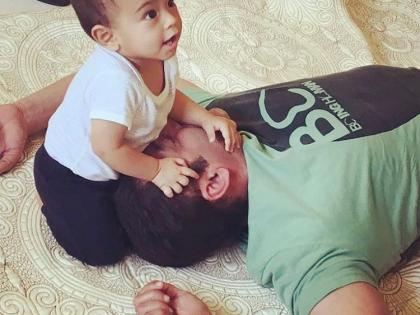 या फोटोंमध्ये सलमान जमिनीवर झोपलेला असून, आहिल त्याच्या पोटावर उभा आहे. आहिलचे दोन्ही हात तोंडात असल्याने तो खूपच क्यूट दिसत आहे. तर आणखी एका फोटोमध्ये आहिल सलमानच्या चेहºयावर दोन्ही हात ठेवून मस्तीच्या मुडमध्ये दिसत आहे. दोघांचे हे फोटो सध्या सोशल मीडियावर चर्चेचा विषय ठरले आहेत. वास्तविक सलमान नेहमीच फावल्या वेळेत भाचा आहिलसोबत वेळ व्यतित करण्याची एकही संधी सोडत नसतो. यापूर्वीदेखील त्याने बºयाचदा आहिलसोबतचे फोटो शेअर केले आहेत.