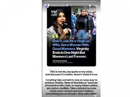 "लग्नासाठी व्हर्जिन मुलगी पाहू नका तर मॅनर्स असलेली मुलगी पाहा. व्हर्जिनिटी एका दिवसात संपते. पण मॅनर्स नाही", असं वक्तव्य प्रियांकाने केल्याच्या पोस्ट फिरत होत्या. अभिनेत्रीने काही वर्षांपूर्वी दिलेल्या मुलाखतीत असं वक्तव्य केल्याचंही पोस्टमध्ये म्हटलं गेलं होतं. पण, आता मात्र या सगळ्या पोस्ट खोट्या असून मी असं वक्तव्य केलं नसल्याचं प्रियांकाने स्पष्ट केलं आहे.