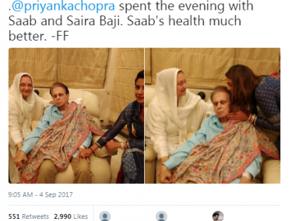 अ िनेत्री प्रियांका चोप्राने बॉलिनवूडचे ज्येष्ठ अभिनेते दिलीप कुमार यांची घरी जाऊन भेट घेतली आहे. भेटी दरम्यानचे काही फोटो सोशल मीडियावर आपल्या फॅन्ससोबत दिलीप कुमार यांनी शेअर केले आहेत. कॅप्शनदेखील देखील देण्यात आले आहे. प्रियांकाने दिलीप साहेब आणि सायराजींसोबत वेळ घालवला. या ट्वीटला प्रियांकानेही रिट्वीट करत उत्तर दिले आहे. ''साहेब आणि सायराजींसोबत काही वेळ घालवला. साहेबांची तब्येत आता बरी आहे. दोघांना भेटून बरं वाटले '' शेअर केलेल्या फोटोंमध्ये सायरा बानूसुद्धा दिसत आहेत. काही दिवसांपूर्वीच दिलीप कुमार यांना रुग्णलायातून डिस्चार्ज देण्यात आला होता. ज्यानंतर अनेक सेलिब्रेटींनी दिलीप साहेबांती घरी जाऊन भेट घेतली. प्रियांकाच्या आधी शाहरुख खानने देखील जाऊन त्यांची भेट घेत तब्येतीची विचारपूस केली होती. शाहरुखने ही आपल्या फॅन्ससोबत भेटी दरम्यानचे फोटो सोशल मीडियावर शेअर केले होते.