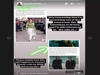 इन्स्टाग्राम स्टोरीमध्ये संबंधित न्यूजचा स्क्रीनशॉट पोस्ट करत प्रियंकाने राग व्यक्त केला. ‘मी सर्वांत मोठ्या चित्रपटाच्या फ्रँचाइसचं प्रमोशन करतेय आणि तरी माझा उल्लेख निक जोनासची पत्नी असा केला जातोय. प्लीज मला सांगा, आजही महिलांसोबत असं का घडतंय. माझ्या बायोमध्ये मी IMDB लिंक अॅड करायला हवी का?’, अशा शब्दांत तिने खंत व्यक्त केली आहे. या पोस्टमध्ये प्रियंकाने पती निक जोनास यालाही टॅग केलं आहे.