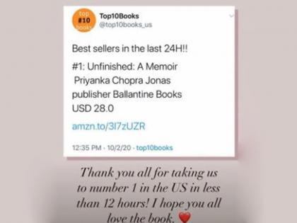 प्रियांका चोप्राने इन्स्टाग्राम स्टोरीवर तिचं पुस्तक बेस्ट सेलर ठरल्याची माहिती दिली आहे. यूएसच्या टॉप १० बुक्सने लिहिले आहे की, गेल्या २४ तासात यूएसमध्ये बेस्ट सेलर्समध्ये नंबर १ प्रियांका चोप्रा जोनसचं पुस्तक अनफिनिश्ड आहे. याबाबत प्रियांकाने सर्वांचे आभार मानत लिहिले की, 'त्या सर्वांचे आभार ज्यांनी यूएसमध्ये गेल्या २४ तासात माझ्या पुस्तकाला नंबर १ वर पोहोचवलं. आशा आहे की, तुम्हाला पुस्तक आवडलं असेल'. प्रियांकाने या पुस्तकात तिच्या जीवनातील छोट्या मोठ्या गोष्टी लिहिल्या आहेत.
