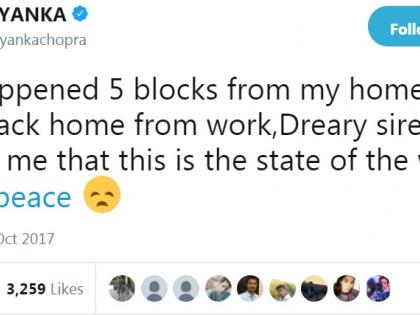 या ट्विटपूर्वी प्रियांकाने हल्ल्यातील मृतांच्या कुटुंबीयांप्रति शोकसंवेदना व्यक्त केल्या होत्या. ‘एनवायसी...नेहमीप्रमाणे जिंदादिल...आय लव्ह यू...हल्ल्यातील मृतांच्या कुटुंबीयांच्या दु:खात मी सहभागी आहे,’अशा शब्दांत तिने आपल्या शोकसंवेदना व्यक्त केल्या होत्या.