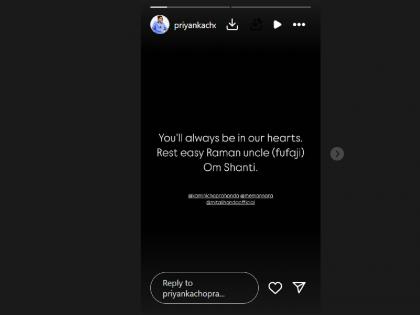 रमन राय हांडा यांच्या निधनानंतर बॉलिवूड अभिनेत्री प्रियांका चोप्रा हिने शोक व्यक्त केला आहे. प्रियांकाने तिच्या इन्स्टाग्राम अकाऊंटवरुन पोस्ट शेअर करत दु:ख व्यक्त केलं आहे. "तुम्ही कायमच आमच्या हृदयात राहाल. रमन काका तुमच्या आत्म्यास शांती लाभो, ओम शांती", असं प्रियांका चोप्राने पोस्टमध्ये म्हटलं आहे. मन्नारा चोप्राचे वडील रमन हांडा हे प्रियांका चोप्रा आणि परिणीती चोप्राचे काका होते. रमन राय हांडा हे प्रियांका चोप्राच्या आत्याचे पती होते. त्यांच्या निधनाने चोप्रा कुटुंबीय दु:खात आहे.