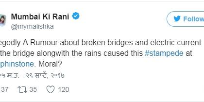 सोशल मीडियावरही एल्फिन्स्टन असा हॅशटॅग ट्रेंडमध्ये आला असून, ‘मुंबईची राणी’ म्हणून ओळखल्या जाणाऱ्या आरजे मलिष्कानेही तिच्या ट्विटर अकाऊंटवरुन ट्विट करत या दुर्देवी घटनेनंतर एक महत्त्वाचा प्रश्न उपस्थित केला आहे. ‘या दुर्घटनेनंतर आधी पूल तुटल्याचं आणि शॉक सर्किटचं कारण देण्यात आलं. त्यानंतर पावसामुळे ही दुर्घटना घडल्याचं म्हटलं गेलं. हीच का तुमची नैतिकता?, असा प्रश्न मलिष्काने तिच्या ट्विटमधून उपस्थित केला आहे. मलिष्काच्या या ट्विटला काही जणांनी रिट्विट केलं आहे. तिचं हे ट्विट पाहता आता ती आणखी काय वक्तव्य करणार याकडेच अनेकांचे लक्ष लागून राहिले आहे. या दुर्घटनेनंतर अनेकांनीच त्यांच्या संतप्त प्रतिक्रिया देत या सर्व प्रकाराबद्दल प्रशासनाच्या निष्काळजीपणावर तीव्र शब्दांत मत व्यक्त केलं आहे.