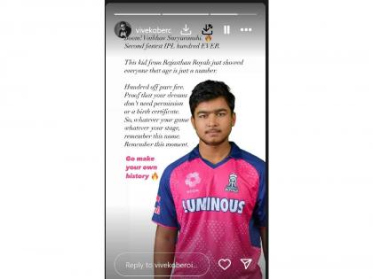 विवेक ओबेरॉय (Vivek Oberoi) लिहितो,"बूम! वैभव सूर्यवंशी...आयपीएलमध्ये वेगवान शतक झळकवणारा दुसरा खेळाडू. राजस्थान रॉयल्सच्या या छोट्या मुलाने वय हा केवळ आकडा असल्याचं दाखवून दिलं आहे. फायर आहे. स्वप्नाला त्याला परवानगीची किंवा बर्थ सर्टिफिकेटची गरज नाही. कोणत्याही स्टेजवर, कोणत्याही गेममध्ये हे नाव लक्षात ठेवा. हा क्षण स्मरणात ठेवा. जा, इतिहास घडवा."