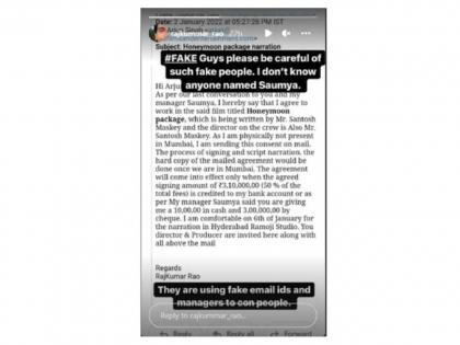 राजकुमार राव याने इन्स्टाग्राम स्टोरीवर त्याच्या नावाने बनवलेल्या बनावट ईमेल आयडीची माहिती दिली आहे. अभिनेत्याने लिहिले, '#FAKE कृपया अशा बनावट लोकांपासून सावध रहा. सौम्या नावाच्या व्यक्तीला मी ओळखत नाही. हे लोक बनावट ईमेल आयडीचा वापरून लोकांना मूर्ख बनवत आहेत. राजकुमारने शेअर केलेल्या बनावट ईमेलच्या कॉपीमध्ये अभिनेत्याच्या नावावर चित्रपट करारासाठी ३.१ कोटींची मागणी करण्यात आली आहे.