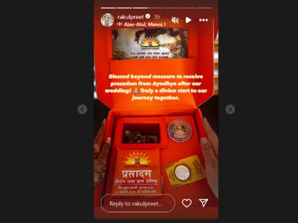रकुल-जॅकीने मित्रपरिवार आणि कुटुंबीयांच्या उपस्थितीत सात फेरे घेत नव्या आयुष्याला सुरुवात केली. पंतप्रधान नरेंद्र मोदींनीही ट्वीट करत या नवविवाहत दाम्पत्याला शुभेच्छा दिल्या होत्या. आता या नवीन सुरुवातीसाठी रकुल आणि जॅकीला लग्नानंतर अयोध्येतील राम मंदिरातून प्रसाद पाठविण्यात आला आहे. रकुलने याचा फोटो शेअर करत इन्स्टाग्रामवर स्टोरी पोस्ट केली आहे. "लग्नानंतर अयोध्येतून प्रसाद मिळाला, हे आशीर्वादापलिकडचं आहे. याने आमची सुरुवात आणखी चांगली होईल", असं रकुलने म्हटलं आहे.