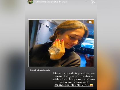 या हिऱ्याविषयी सोशल मीडियावर वेगवेगळ्या चर्चा रंगल्यानंतर तमन्नाने तिच्या इन्स्टाग्राम स्टोरीमध्ये एक फोटो शेअर केला. सोबतच हा हिरा नसून ते एक बाटली ओपनर असल्याचं स्पष्ट केलं आहे. " आम्ही बॉटल ओपनरसह फोटोशूट करत होतो वास्तविक हा हिरा नाही" #girlsliketoclickpics", असं कॅप्शन देत तमन्नाने निर्माण झालेला गैरसमज दूर केला आहे.