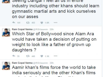 Aamir khan's films force the world to take india seriously and the other Khan's films make india look like a Choothiya regressive country— Ram Gopal Varma (@RGVzoomin) December 27, 2016}}}} ">http://