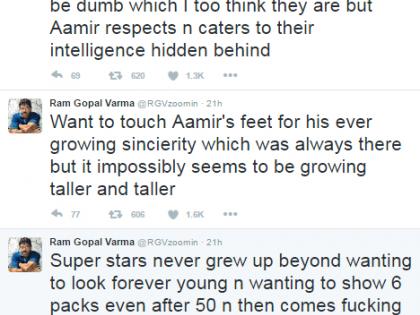 Aamir khan's films force the world to take india seriously and the other Khan's films make india look like a Choothiya regressive country— Ram Gopal Varma (@RGVzoomin) December 27, 2016}}}} ">— Ram Gopal Varma (@RGVzoomin)