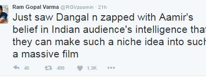 दंगल हा चित्रपट पाहिल्यावर ट्विटरवरून आपली प्रतिक्रिया देताना रामगोपाल वर्मा यांनी ‘दंगल’ या चित्रपटासाठी आमीर खानची प्रशंसा केली आहे. राम गोपाल वर्मा यांनी आपल्या ट्विटर अकाऊंटवर लिहलेय. ‘‘आमीर खानच्या चित्रपटातून भारतातील परिदृश्ये जगाने गंभीरतेने घ्यावी अशा संदेश देणारी असतात तर अन्य खानचे चित्रपट मूर्खपणा व मागसलेपणा दाखविणारी आहेत’’. यानंतर राम गोपाल वर्मा यांनी दंगलची प्रशंसा करताना ट्विटरवर पोस्टची रिघच लावली एका पोस्टमध्ये त्याने आमीर चे पायाचा स्पर्श करावा, हे शक्य नाही कारण त्याचा आलेख उत्तरोत्तर वाढत चालला आहे, असा उल्लेख केला आहे.