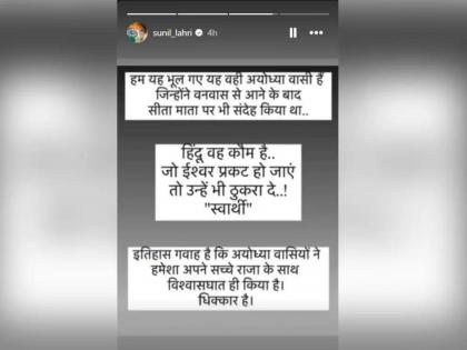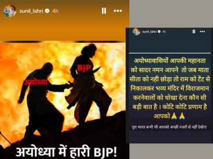 सुनील लहरी यांनी अयोध्येतील भाजपाच्या पराभवावर इन्स्टाग्रामवर एक स्टेटस पोस्ट केला आहे. ज्यामध्ये त्यांनी राम आणणाऱ्याला अयोध्येतील जनतेने साथ दिली नाही यावर नाराजी व्यक्त केली आहे. याशिवाय 'कटप्पा' आणि बाहुबलीचं उदाहरण दिलंय. सुनील लहरी यांनी लिहिलंय की, "अयोध्यावासी जनतेला आदरपूर्वक नमस्कार. तुम्ही सीतामातेला सोडलं नाही तर ज्या माणसाने रामाला टेंटमधून बाहेर काढून भव्य मंदिरात आणले त्याचा विश्वासघात करणं ही तुमच्यासाठी मोठी गोष्ट नाही. तुम्हाला कोटी कोटी प्रणाम. संपूर्ण भारत तुम्हाला कधीही चांगल्या नजरेने पाहणार नाही."