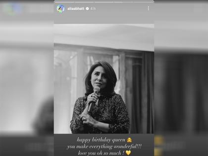 अभिनेत्री आलिया भटने नीतू कपूर यांचा एक सुंदर फोटो तिच्या इन्स्टाग्राम स्टोरीवर पोस्ट केला आहे. 'हॅपी बर्थडे क्वीन. तुम्ही सर्व काही खास बनवता. तुम्हाला खूप खूप प्रेम.' असं कॅप्शन तिने या फोटोसोबत दिलं आहे.