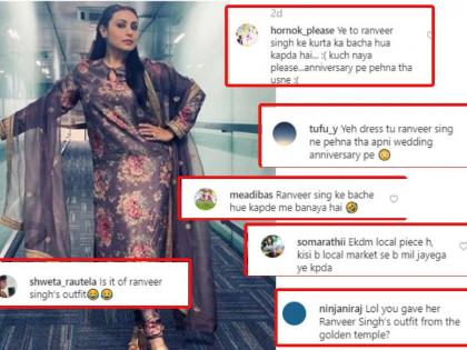 नुकताच एक फोटो सोशल मीडियावर व्हायरल होताना दिसतो आहे. या फोटोत रणवीर सिंग आणि राणी मुखर्जी एक सारख्या कपड्यांमध्ये दिसत आहेत. लग्नाच्या पहिल्या वाढदिवसादिवशी रणवीर सिंगने फ्लोरल प्रिंट असलेलं डार्क रंगाचा कुर्ता व पायजमा परिधान केला होता आणि नुकताच तशीच प्रिंट असलेल्या ड्रेसमध्ये बॉलिवूडची मर्दानी म्हणजेच राणी मुखर्जी दिसली. त्यानंतर तिला नेटकऱ्यांनी ट्रोल करायला सुरूवात केली.