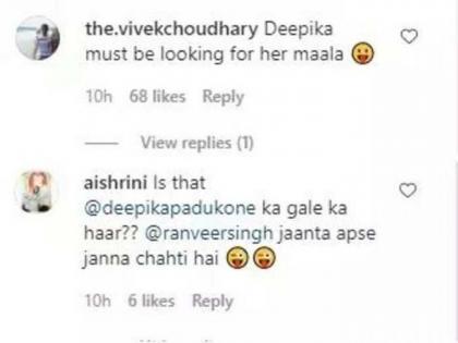 या फोटोत रणवीर सिंह बाल्कनीत आहे आणि मागे समुद्र दिसतो आहे. कॅप्शनला रणवीर सिंहने लिहिले की, 'सुहाना सफर और ये मौसम हसीं...' त्याच्या इन्स्टा फॉलोअर्सचं लक्ष रणवीर सिंहच्या नेकपीसने वेधलं. जास्तीत जास्त लोकांनी प्रश्न उपस्थित केला आहे की, हा हार दीपिका पादुकोनचा आहे का?. एका दुसऱ्या यूजरने लिहिले की, दीपिका तिची माळ शोधत आहे. एकाने कमेंट केली की, दीपिकाच्या गळ्यातील हार, लोकांना हे जाणून घ्यायचं आहे? तर यावर अर्जुन कपूर म्हणाला की, 'बाबा तू हिरा नाही मोती आहेस'.