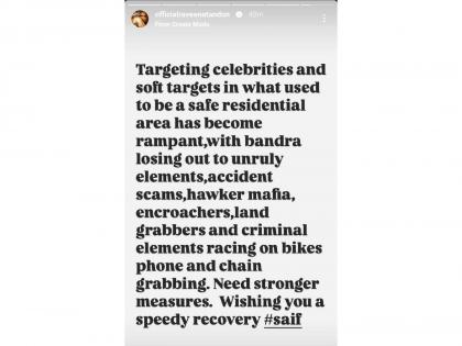 रवीना टंडनने ट्वीट करत लिहिले, "बांद्रा सुरक्षित रहिवासी परिसर होता. पण आता फोन, चेन स्नॅचिंग, फेरीवाले, अपघात, जमिनीवर अतिक्रमण, गुन्हे अशा गोष्टी बांद्रात घडत आहेत. सेलिब्रिटींना यामध्ये सहज लक्ष्य केलं जात आहे. यासंदर्भात कडक कारवाई होणं गरजेचंच आहे. सैफ अली खानच्या प्रकृतीत सुधारणा व्हावी हीच प्रार्थना."