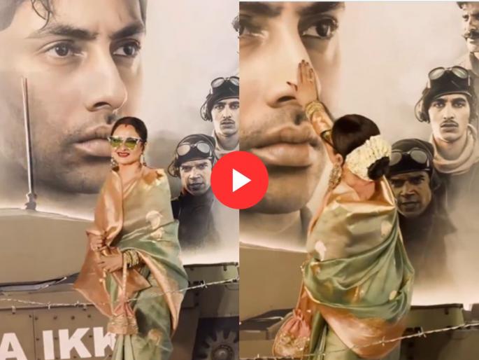 बॉलीवूडची सदाबहार अभिनेत्री रेखा आपल्या खास शैलीसाठी आणि सौंदर्यासाठी नेहमीच चर्चेत असते. नुकतीच रेखा यांनी 'इक्कीस' (Ikkis) या चित्रपटाच्या विशेष स्क्रीनिंगला हजेरी लावली. यावेळी रेखाने काही असे केले की ज्याची चर्चा आता संपूर्ण सोशल मीडियावर रंगली आहे. तिने चक्क अमिताभ बच्चन यांचा नातू आणि या चित्रपटात प्रमुख भूमिका साकारणाऱ्या अगस्त्य नंदा याच्या पोस्टरला 'फ्लाइंग किस' देऊन आपले प्रेम आणि आशीर्वाद दिला.