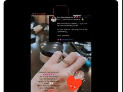 रश्मिका मंदानाने शेअर केलेल्या फोटोत आपल्याला तिच्या हातात एक सुंदर अंगठी पाहायला मिळत आहे. एवढेच नव्हे तर तिने एक व्हिडिओ सोशल मीडियावर शेअर केला होता. या व्हिडिओत ती तिची अंगठी दाखवत असून मला तू मिळालास... असे लिहिले आहे. या फोटोवरून रश्मिकाने साखरपुडा केला का अशी चर्चा नेटिझन्समध्ये रंगली आहे.