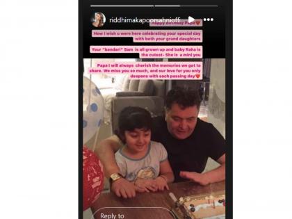 रिद्धिमाने तिच्या इन्स्टाग्रामवर तिची लेक समायरा आणि ऋषी कपूर यांचा एक फोटो शेअर केला आहे. या फोटोमध्ये ऋषी कपूर आणि समायरा बर्थ डे सेलिब्रेट करताना दिसत आहेत. या फोटोला रिद्धिमाने खास कॅप्शनही दिलं आहे. "हॅपी बर्थडे पापा...तुम्ही इथे असता तर आज तुमच्या दोन्ही नातींसोबत बर्थडे सेलिब्रेट केला असता. तुमची बंदरी सॅम आता मोठी झाली आहे आणि बेबी राहा खूप क्यूट आहे. ती अगदी तुमच्यासारखी आहे. तुमच्याबरोबर घालवलेले प्रत्येक क्षण मी सेलिब्रेट करते. आम्हाला तुमची खूप आठवण येते. तुमच्यासाठी आमचं प्रेम दिवसेंदिवस वाढत चाललं आहे", असं कॅप्शन या फोटोला तिने दिलं आहे.