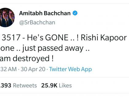 ऋषी कपूर यांचे मित्र सुपरस्टार अमिताभ बच्चन यांनी ट्विट करत ऋषी कपूर यांच्या निधनाची माहिती दिली. ''तो गेला. ऋषी कपूर गेले. त्यांचे निधन झाले. मी तुटलो आहे.'' असे ट्विट अमिताभ यांनी केले आहे. अमिताभ बच्चन यांनी हे ट्वीट काही वेळातच टिलीट केले.