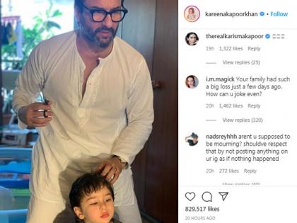 ‘आणखी कुणाला हेअरकट करायचीये?’ असे तिने गमतीने कॅप्शनमध्ये लिहिलेय. करिनाने हा फोटो शेअर केला आणि युजर्सनी तिला ट्रोल करणे सुरु केले. काही दिवसांपूर्वीच कपूर कुटुंबातील एका सदस्याचे निधन झाले असताना करिनाला विनोद सुचतोय म्हटल्यावर युजर्सनी बेबोला अनेक गोष्टी सुनावल्या.