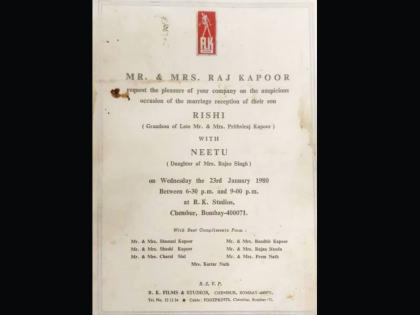 नीतू आणि ऋषी कपूर यांच्या लव्हस्टोरीबद्दल लोकांना माहिती आहे. २३ जानेवारी, १९८० रोजी दोघांचे लग्न झाले. व्हायरल होत असलेले कार्ड या दोघांच्या लग्नाचे रिसेप्शन कार्ड आहे. व्हायरल होत असलेल्या कार्डनुसार, दोघांचे रिसेप्शन स्थळ आरके स्टुडिओमध्ये होते. लग्नानंतर झालेल्या या रिसेप्शनला बॉलिवूडमधील अनेक सेलिब्रिटींनी हजेरी लावली.