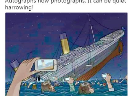 ‘स्मार्टफोनला धोका...आधी आॅटोग्राफ होता, आता फोटोग्राफ. हे शोकजनक असू शकते,’असे दुसरे ट्विट केले. या टि ट्विटसोबत त्यांनी एक फोटोही शेअर केला. यात टायटॅनिक जहाज समुद्रात डुंबतयं आणि लोक समुद्रातून त्याचे फोटो घेत आहेत. ‘टायटॅनिक २०१८ मध्ये डुंबले तर....’ असे या फोटोवर लिहिले आहे.