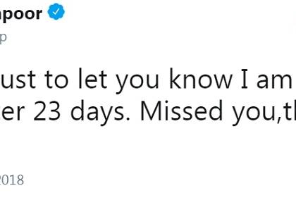 ‘सर्वांना नमस्ते. मी २३ दिवसांनंतर ट्विटरवर परततोय. तुम्हा सर्वांना मिस केले. तसेच भांडण आणि मस्तीही मिस केली,’ असे त्यांनी लिहिले. ते इथेच थांबले नाहीत तर त्यांनी पुन्हा एक ट्विट केले.