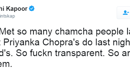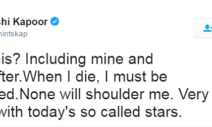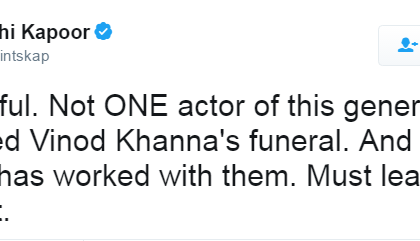 ऋषी कपूर यांनी ट्वीट करुन आपला राग व्यक्त केला आहे,'' प्रियांका चोप्राच्या पार्टी रात्री चमचे दिसले होते मात्र विनोद खन्ना यांच्याअंत्यसंस्कारच्यावेळी यांच्यापैकी कोणी दिसले नाही. एवढ्यावरच ते थांबले नाहीत पुढे ते म्हणाल, मी या गोष्टीसाठी सुद्धा तयार आहे उद्या मी मेल्यावरही मला कोणी कांधा द्यायला येणार नाहीत. माझा मुलगा रणबीर आणि पत्नी नीतू सिंग सध्या परदेशी आहेत नाहीतर ते विनोद खन्ना यांचे अंतिम दर्शन घेण्यासाठी आले असते.