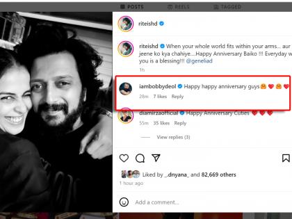 रितेशच्या या पोस्टवर कमेंट करत चाहत्यांबरोबरच सेलिब्रिटींनीही त्यांना लग्नाच्या वाढदिवसाच्या शुभेच्छा दिल्या आहेत. बॉलिवूड अभिनेता बॉबी देओलनेही रितेशच्या या पोस्टवर कमेंट केली आहे. "हॅपी अॅनिव्हर्सरी" असं म्हणत बॉबीने रितेश-जिनिलीयाला खास अंदाजात शुभेच्छा दिल्या आहेत.