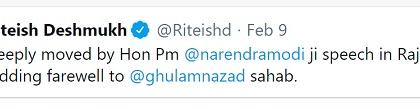 ‘गुलाम नबी आझाद साहेब राज्यसभेतून निवृत्त होत असताना पंतप्रधान नरेंद्र मोदी यांनी केलेल्या भाषणाने मी प्रचंड प्रभावित झालोय,’ असे ट्विट रितेशने केले आहे.