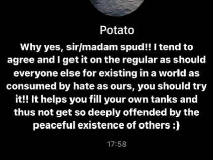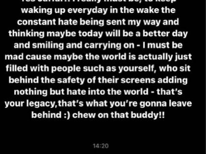 तसंच जाफर नावाच्या व्यक्तीने तिला 'तू पागल आहे का?' असे विचारले. त्याला ती म्हणाली,'हो जाफर, मी पागल असायलाच पाहिजे रोज सकाळी उठल्यावर माझ्या मार्गात जो तिरस्कार येत आहे आणि आजचा दिवस चांगला असेल असा मी विचार करण्याचा प्रयत्न करते. मी खरंच वेडी असेन कारण हे जग तुझ्यासारख्या लोकांनी भरलेलं आहे जे स्क्रीनमागे लपून जगात तिरस्कार पसरवण्याशिवाय दुसरं काही करत नाहीत, हाच वारसा तुम्ही चालवत आहात.'