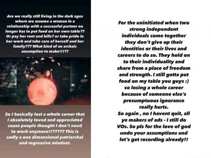 पुढे ती म्हणते, "हे कसली अशी जुनाट विचारसरणी आहे. मी बेसिकली माझं सगळं करिअर गमावलं ज्याच्यावर माझं खूप प्रेम होतं. लोकांना असं वाटायला लागलं होतं की आता मला काम करण्याची गरज नाही. हे खूप वाईट आहे की, हे एक डाइमेंशनल पॅटरियारकल आणि मागसलेली विचारसरणी आहे. ज्या लोकांना माहित नाहीये त्यांच्यासाठी सांगते, स्वत:च्या पायावर उभे असलेले जे दोन लोक एकत्र येतात तेव्हा ते कधीच त्यांचं करिअर सोडत नाहीत. ते कायम त्यांची ओळख निर्माण करत असतात."