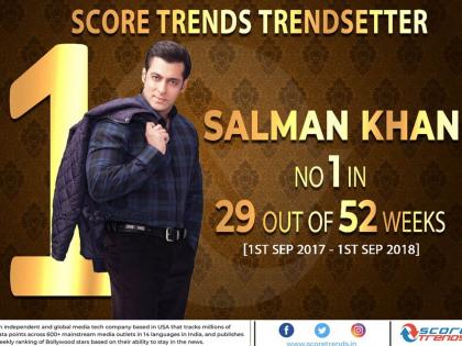 स्कोर ट्रेंड रिपोर्टच्यानूसार, सर्व सोशल प्लॅटफार्मवर (ट्विटर, इंस्टाग्राम, फेसबुक, न्यूज़प्रिंट, डिजिटल न्यूज, आणि व्हायरल न्यूज) 52 आठवड्यांपैकी 29 आठवडे सलमान खान सर्वाधिक लोकप्रियतेच्या यादीत अग्रणी स्थानावर राहिला. जे कोणत्याही सेलिब्रिटीसाठी एक मोठं यश म्हणता येईल.