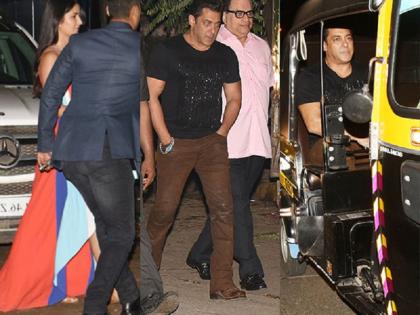 स मान खान स्टारपद मिरवत नाही तर ते विसरून जगतो. ताजे उदाहरण द्यायचे झाल्यास कालचेच घ्या. होय, अगदी कालचे. सध्या सलमान त्याच्या ‘ट्यूबलाईट’ या आगामी सिनेमाच्या प्रमोशनमध्ये व्यस्त आहे. अशाच एका प्रमोशनल इव्हेंटच्या निमित्ताने काल रात्री सलमान खान मेहबूब स्टुडिओत आला होता. सलमानची एक्स गर्लफ्रेन्ड कॅटरिना कैफ ही सुद्धा तिच्या आगामी ‘जग्गा जासूस’ या चित्रपटाच्या प्रमोशनसाठी या स्टुडिओत आली होती. मग काय, इव्हेंट संपला आणि सलमान व कॅटरिना स्टुडिओबाहेर पडले. पण बाहेरचे दृश्य पाहून सगळ्यांनाच आश्चर्याचा धक्का बसला. आता स्टुडिओबाहेर असे काय घडले, असा विचार तुम्ही करत असाल तर ऐका! त्याचे झाले असे की, सलमान कॅटरिनाला तिच्या गाडीपर्यंत सोडायला गेला. यानंतर जे झाले, त्याची कुणी कल्पनाही केली नव्हती. होय, कॅटरिनाला तिच्या गाडीपर्यंत ड्रॉप केल्यानंतर सलमान स्वत: आॅटो रिक्षात बसून घरी रवाना झाला. यावेळी निर्माते रमेश तौरानी हेही त्याच्यासोबत होते. यावेळचे सलमान व कॅटरिनाचे काही फोटो आमच्या हाती लागले आहेत.