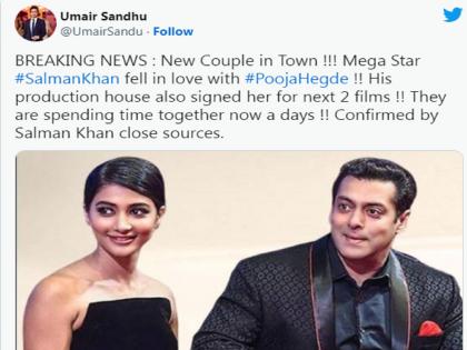 ‘ब्रेकिंग न्यूज...टॉऊनमध्ये नवं कपल आलं आहे. मेगास्टार सलमान खानला पूजा हेगडेशी प्रेम झालं आहे. सलमानच्या प्रॉडक्शन हाऊसने पूजाला पुढच्या 2 सिनेमांसाठी साईन केलं आहे. हे दोघं सध्या एकमेकांसोबत बराच वेळ घालवत आहेत. सलमानच्या जवळच्या सूत्रांनी ही गोष्ट कन्फर्म केली आहे,’ अशा आशयाचं ट्विट उमैर संधूने केलं आहे.